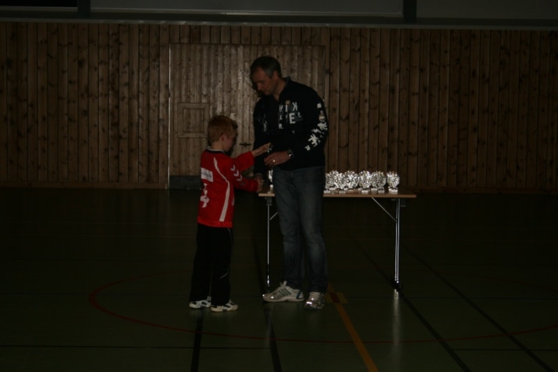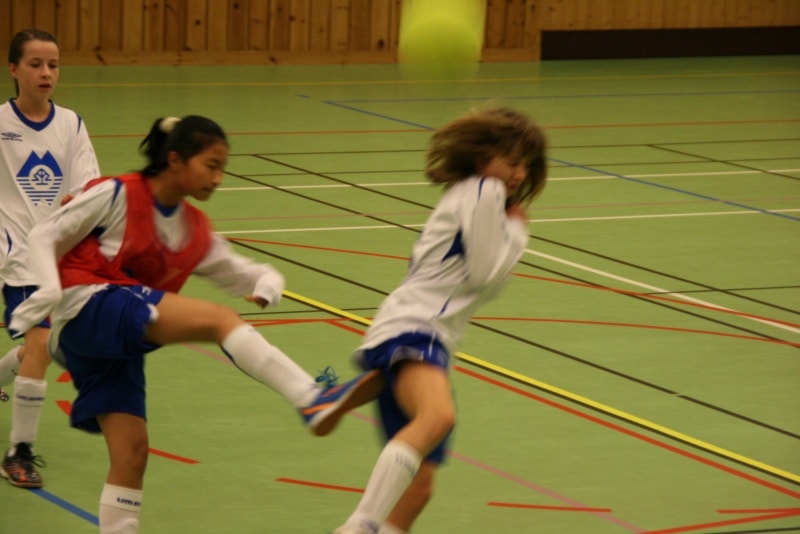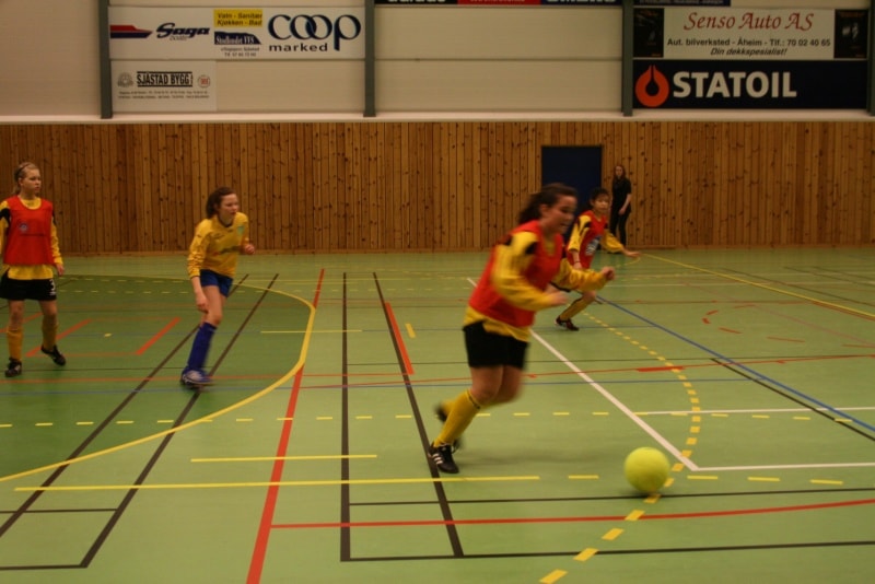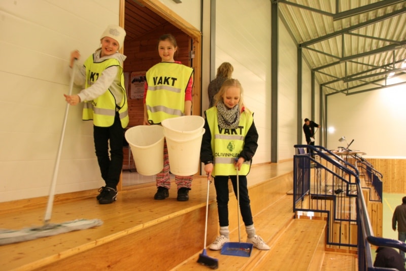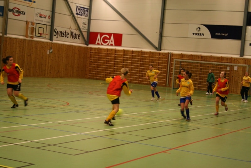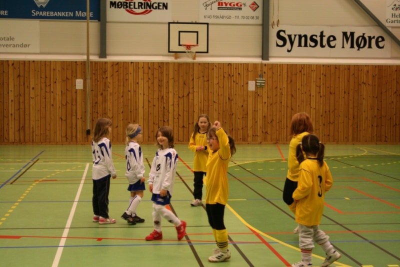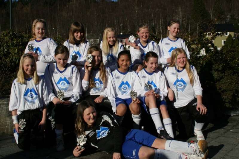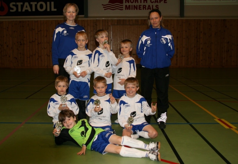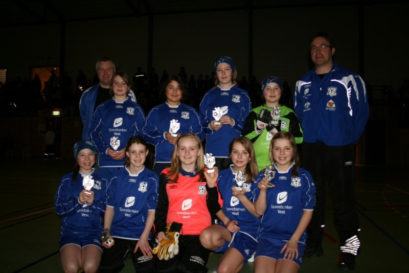 Tre klasser og elleve lag står for underhaldninga i kveld. Det er klassene Minijenter 9/1, Lillejenter -99 og smågutar 14. På biletet ser vi dei fire laga i Minijenter 9/10 med premiane sine.