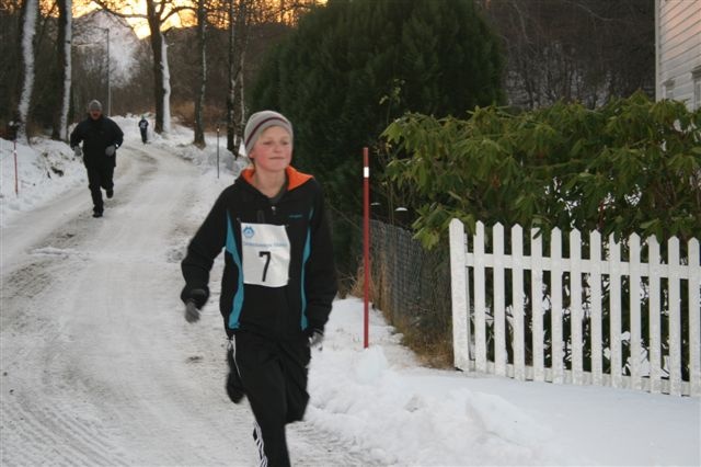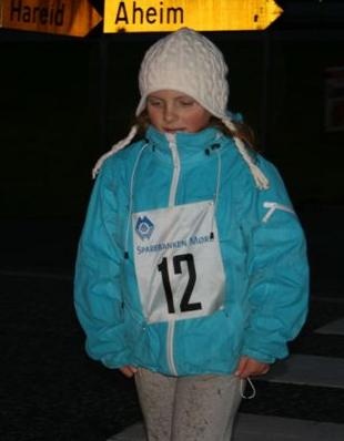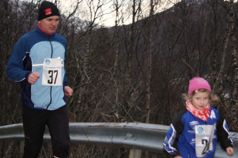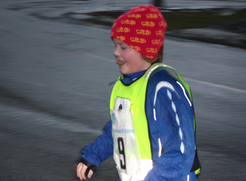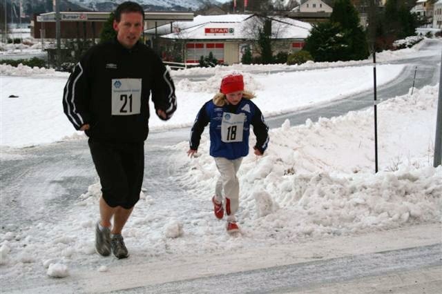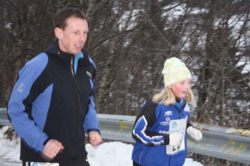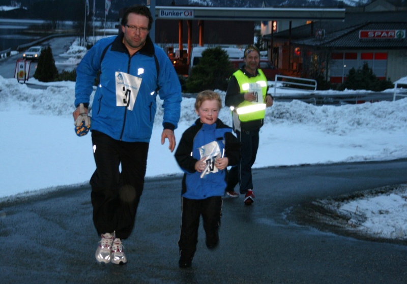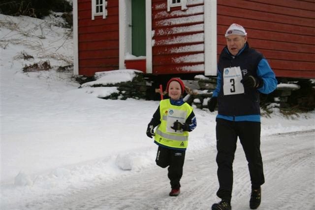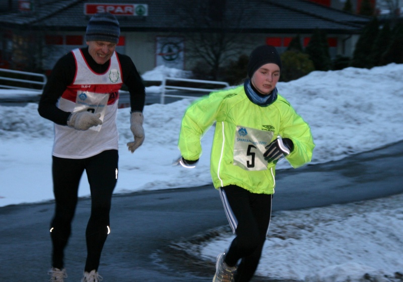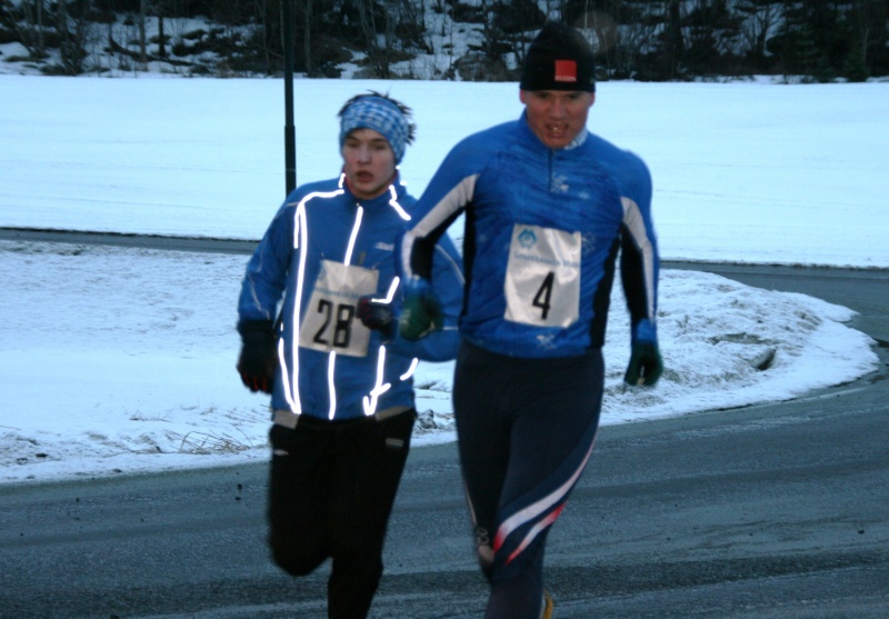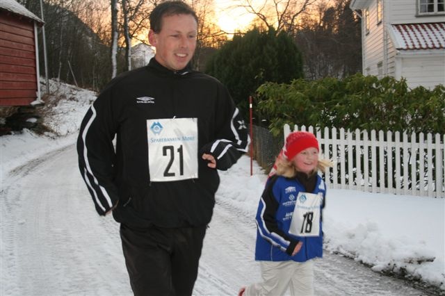 Det første løpet i vinterkarusellen laurdag 22. november, samla trettifem deltakarar. Det var mange som var borte og ein del prioriterte anna "oppvarming" og pynting. Men ein del var altså på plass og tok dette som oppvarming til dansen på julebordet og stilte også sikkert med god matlyst og raude roser i kinna og dessutan like friske inni som utanpå. Det var glatt gjennom løypa og raskaste løpar, Alexander, måtte nedpå ved Åheimtun. På biletet ser vi Elisabeth og pappaen i flott stil. Elisabeth var ei av dei får som persa denne gongen. Føreløpige resultat nedanfor. Lengre nede på sida finn du også bilde frå løpet.