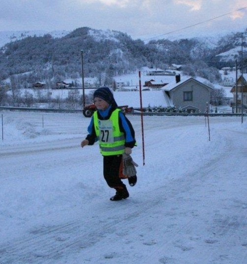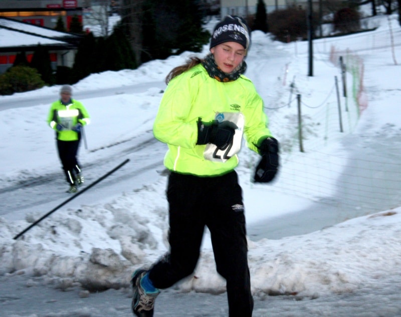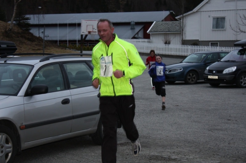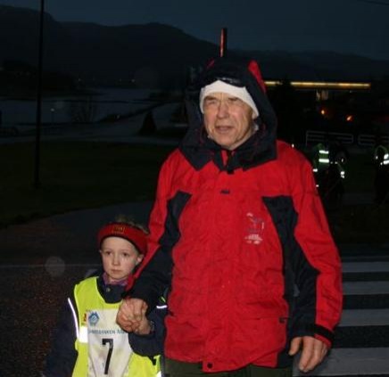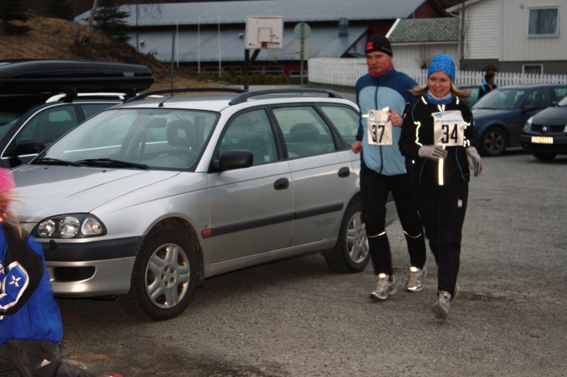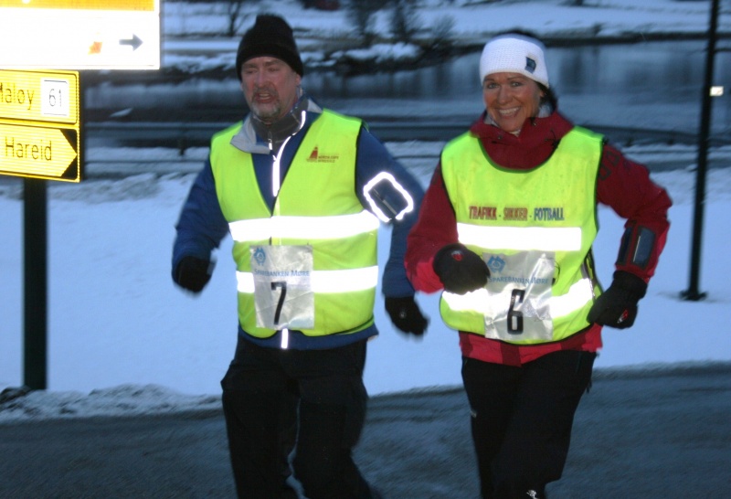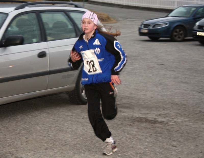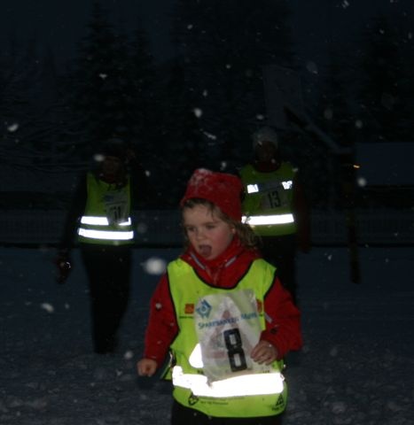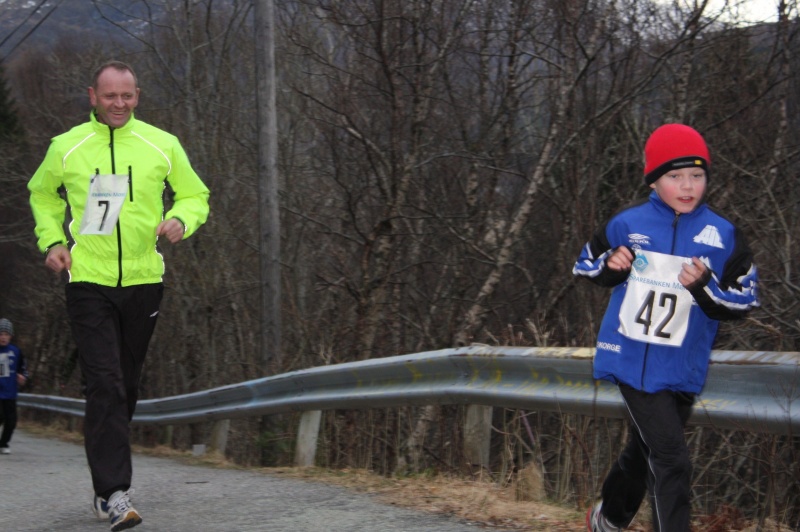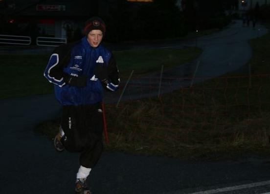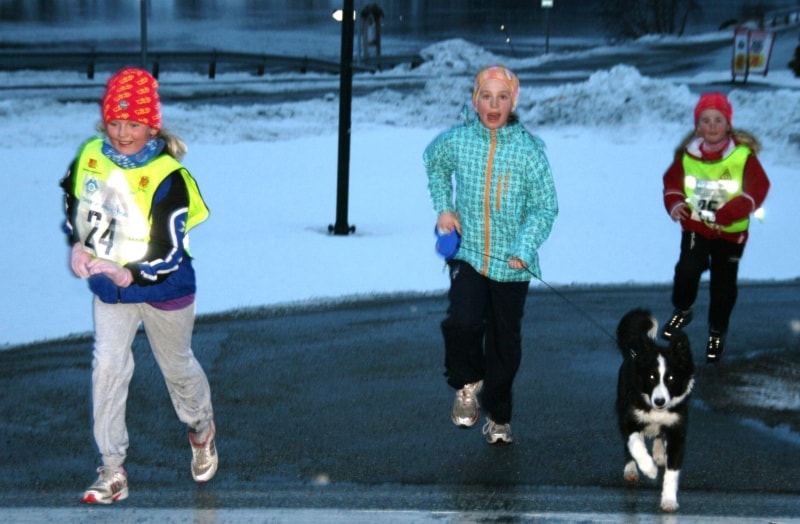 Det første løpet i vinterkarusellen laurdag 22. november, samla trettifem deltakarar. Det var mange som var borte og ein del prioriterte anna "oppvarming" og pynting. Men ein del var altså på plass og tok dette som oppvarming til dansen på julebordet og stilte også sikkert med god matlyst og raude roser i kinna og dessutan like friske inni som utanpå. Det var glatt gjennom løypa og raskaste løpar, Alexander, måtte nedpå ved Åheimtun. På biletet ser vi Elisabeth og pappaen i flott stil. Elisabeth var ei av dei får som persa denne gongen. Føreløpige resultat nedanfor. Lengre nede på sida finn du også bilde frå løpet.